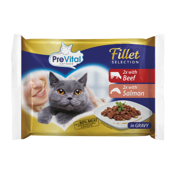 PreVital Cat Food Fillet 2x Beef + 2x Salmon in Gravy (4x85g) is a premium wet food multipack designed for adult cats, offering a delightful variety of flavors and essential nutrients to support overall health and well-being.
