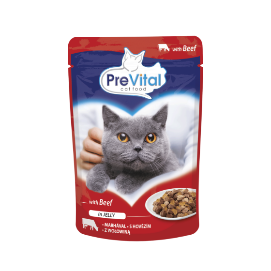 PreVital Cat Food With Beef in Jelly 100g is a wet cat food designed to provide complete and balanced nutrition for adult cats. It contains essential nutrients to support your cat's overall health and well-being.