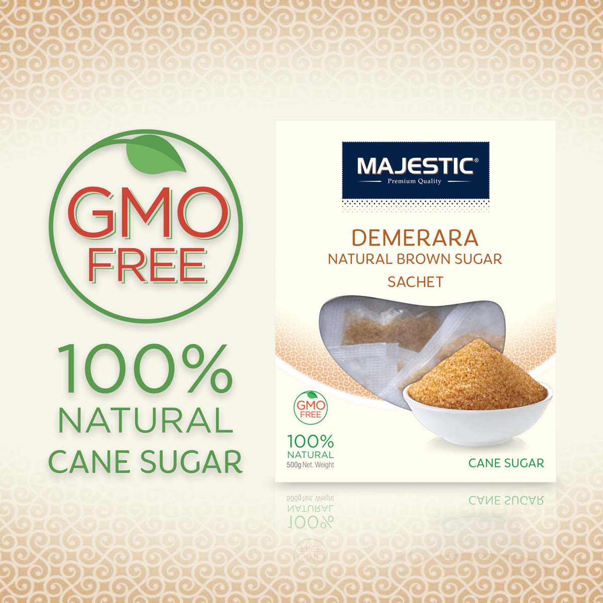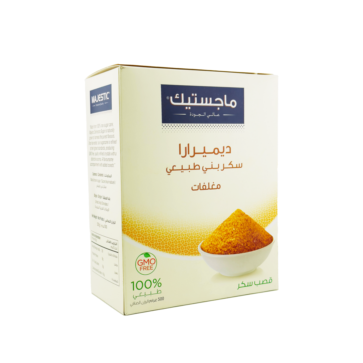 "Made from 100% raw sugar cane, Majestic Demerara Sugar is naturally grown to harness the purest flavours. Once harvested, our sugarcane is refined to the highest standards, producing GMO free, quality refined crystals with a distinctive aroma. A flavoursome accompaniment with added crunch."